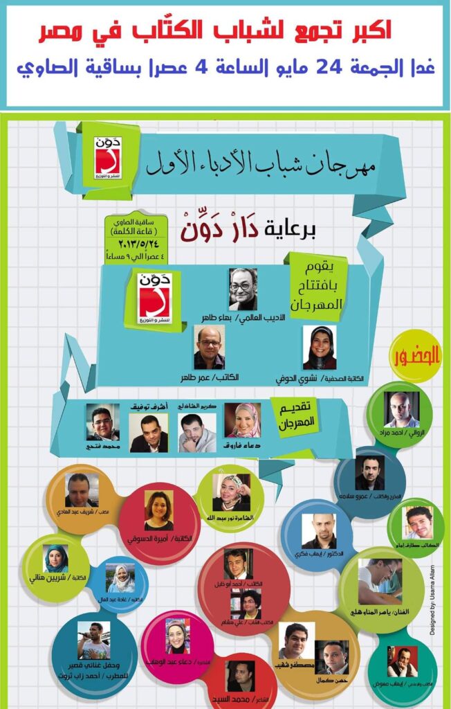 في خطوة فريدة من نوعها تهدف لإتاحة الفرصة أمام شباب المبدعين، والتحرر من القيود والتغلب على التقليدية، نظمت دار دوِّن للنشر والتوزيع في مايو 2013، مهرجانًا ثقافيا بالتعاون مع ساقية الصاوي، وبمشاركة العديد من الكتاب والفنانين ودور النشر.